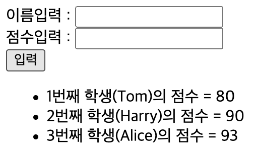 <div>{{index+1}}번째 학생({{i.name}})의 점수 = {{i.score}}</div>