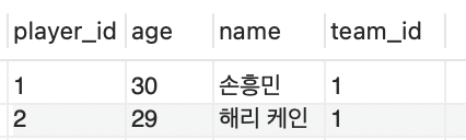 - Player가 연관관계 주인이기 때문에 team_id라는 column에 Team의 id가 들어간 것을 확인할 수 있음