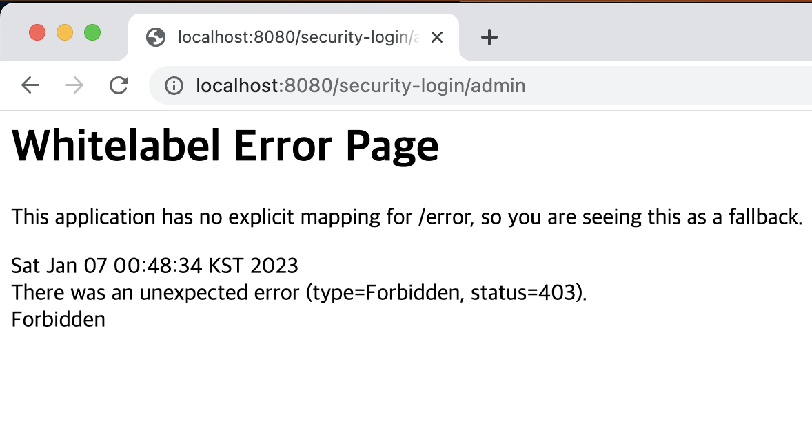 - 관리자 페이지 (인가 실패, 쿠키나 세션과는 달리 Spring Security에서 에러를 발생 시켜줌 => Http Error 403(Forbidden)이 발생해야 함)
