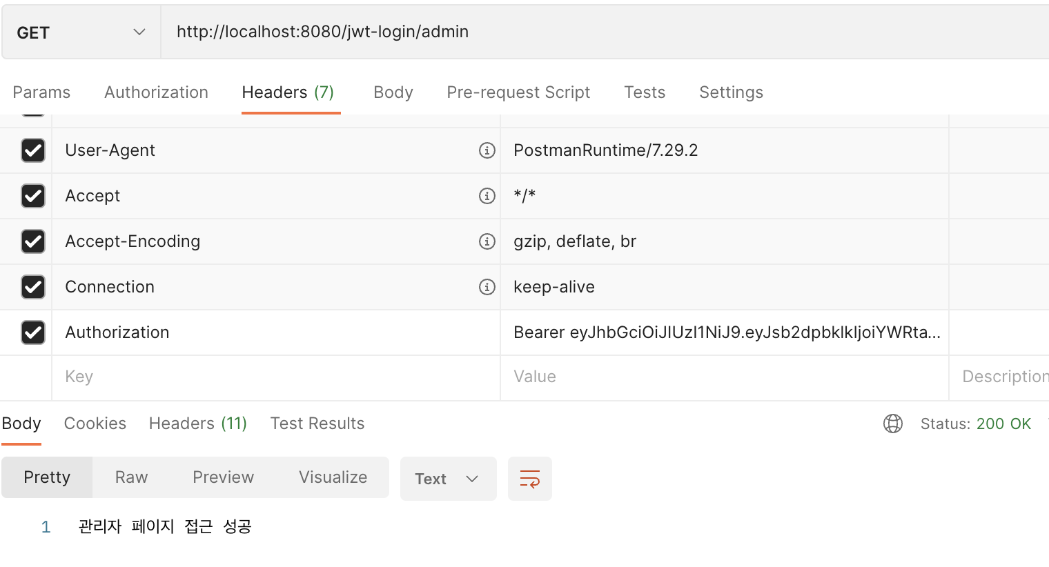 - 인가 성공 (권한이 ADMIN인 유저로 로그인 후 접근한 경우)
