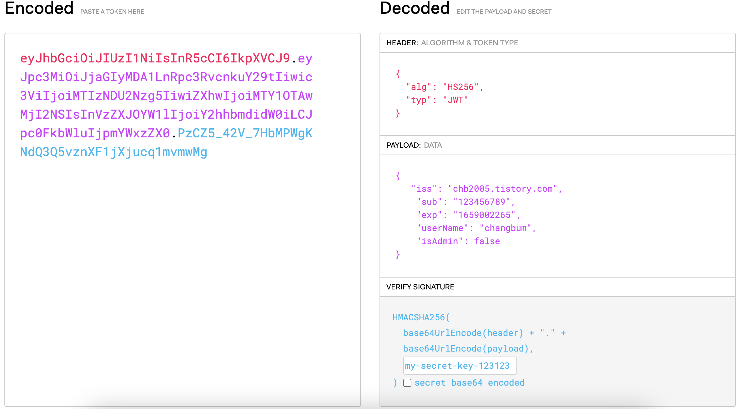 - 하지만 Signatur 값은 우리가 지정한 비밀키(ex) my-secret-key-123123)를 알아야만 구할 수 있음