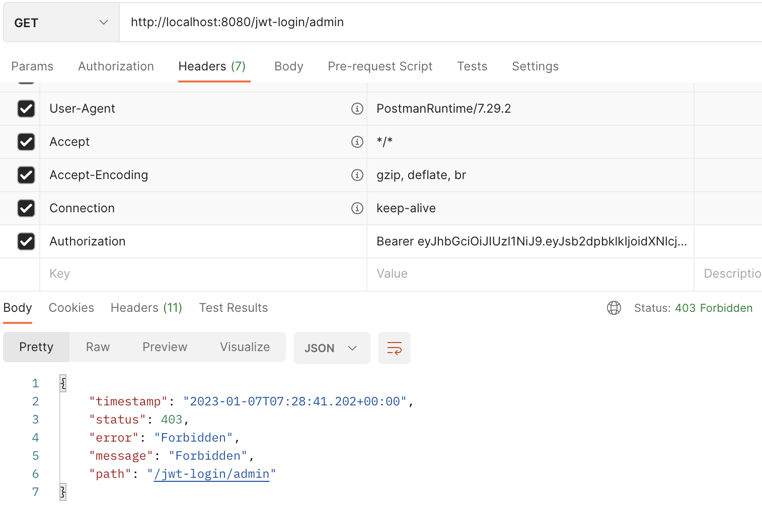 - 인가 실패 (권한이 ADMIN이 아니기 때문에 접근 불가)