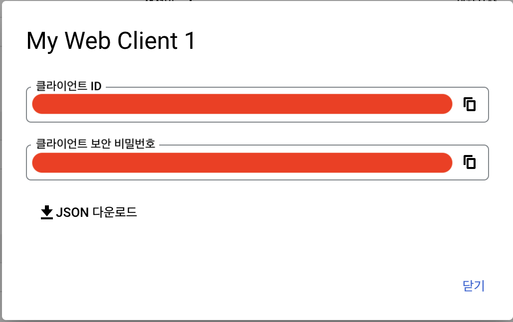 - 생성이 완료되면 다음과 같이 클라이언트 ID와 클라이언트 보안 비밀번호를 다운받을 수 있음