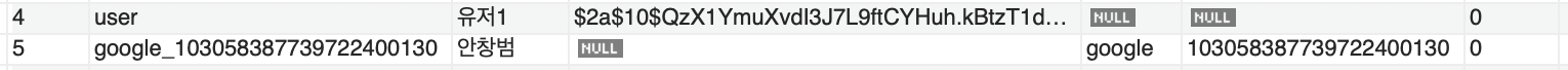 - 4번 유저는 직접 회원가입한 유저, 5번 유저는 구글 로그인을 통해 가입한 유저
