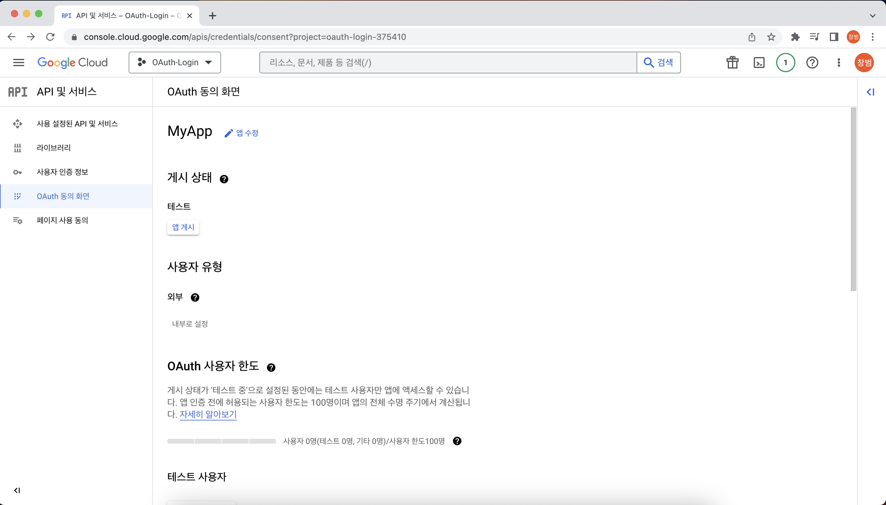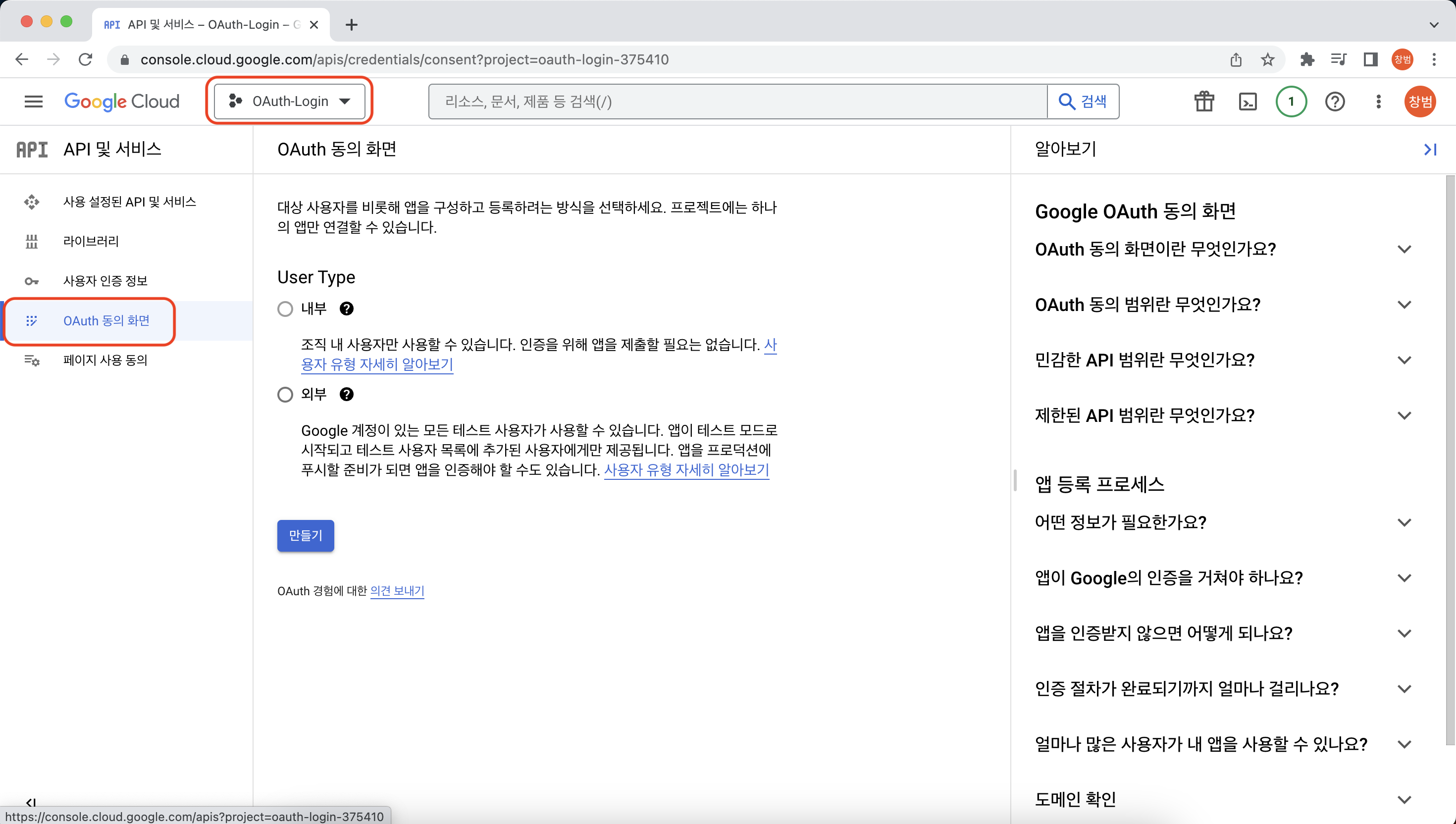 - 방금 생성한 프로젝트로 이동 후 OAuth 동의 화면 탭으로 이동