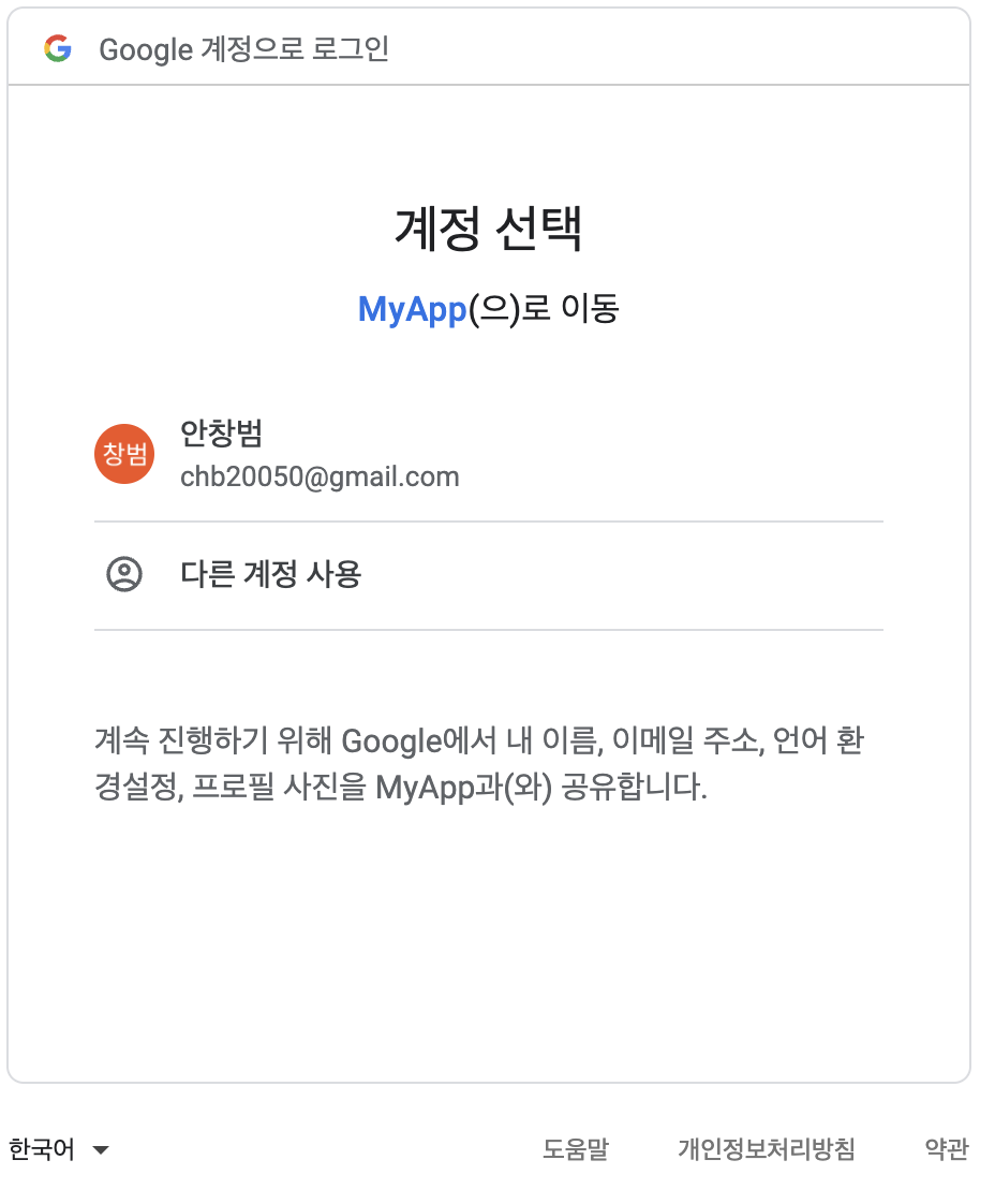 - 구글 로그인 클릭 시 아래와 같이 구글 로그인이 자동으로 진행됨