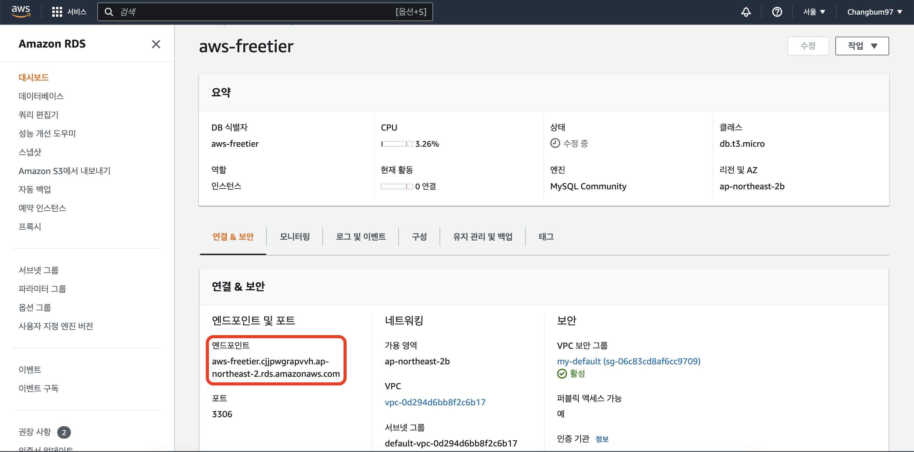 - VPC 보안 그룹(방화벽) : 위에서 만든 보안그룹 선택
