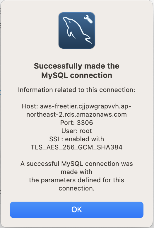 - RDS 생성 및 Workbench와의 연결이 성공했다면 Test Connection 시 아래와 같이 성공창이 뜸