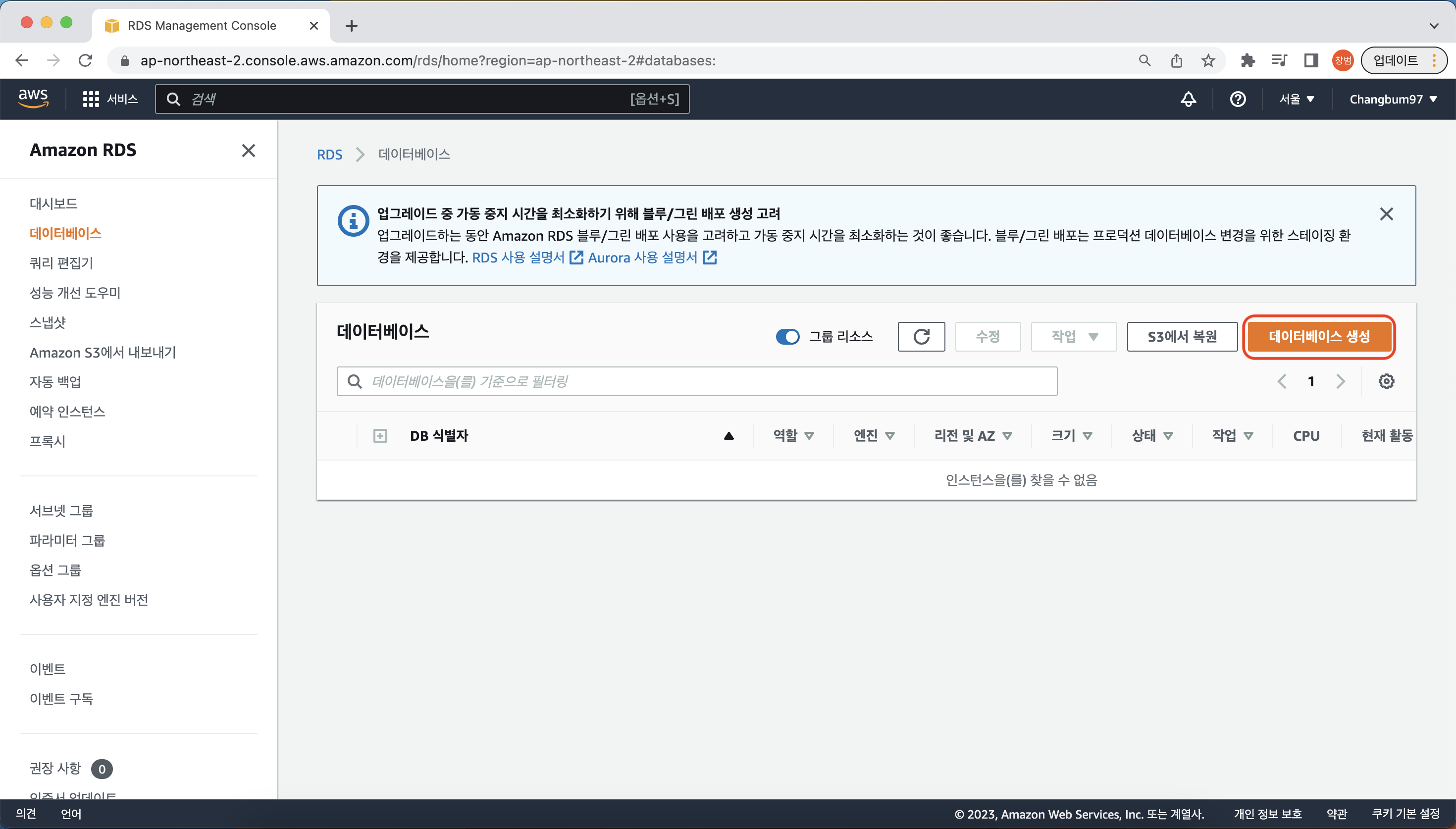 - AWS RDS 서비스 진입 후 데이터베이스 생성 클릭