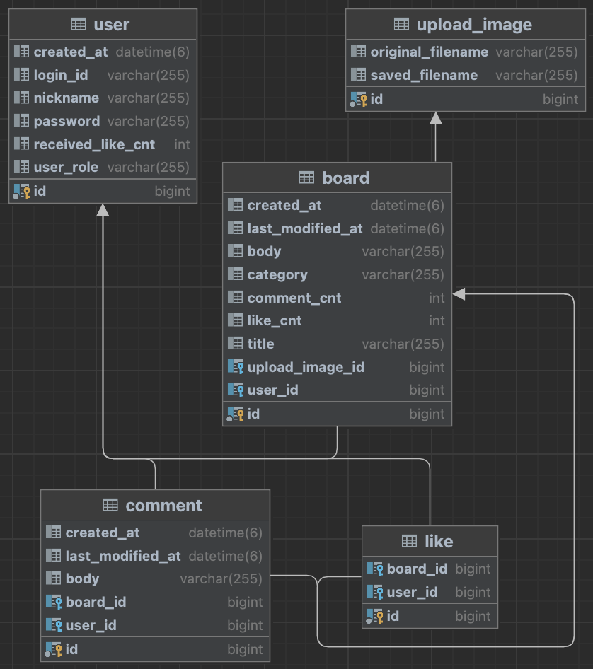 - Like는 user_id, board_id를 foreign key로 갖는데, user_id는 좋아요를 누른 유저의 아이디이고, board_id는 좋아요가 달린 게시글의 id