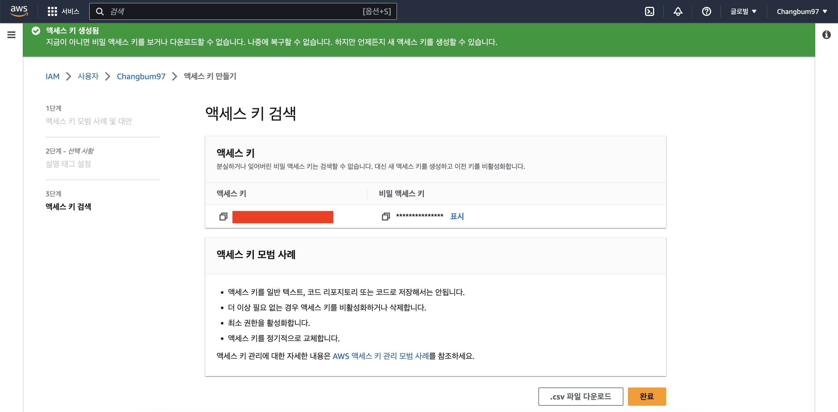 - 액세스 키를 만들면 아래와 같이 액세스 키와 비밀 액세스 키를 확인할 수 있는데, 이 값들을 저장후 완료