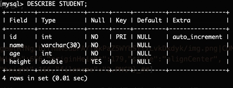 - 속성으로는 NOT NULL(반드시 입력), AUTO_INCREMENT(자동 증가), PRIMARY KEY(기본키로 지정) 등이 있음