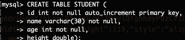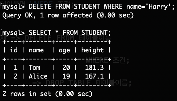- 자료형은 INT(정수), VARCHAR(문자열), DOUBLE(실수), BOOLEAN 등이 있음