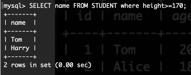 - OR, ANd : WHERE (id=1) OR (name="Harry")
