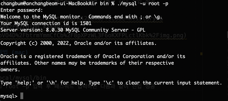 - ./mysql -u root -p 입력 후 패스워드 입력하면 다음과 같이 진입 성공