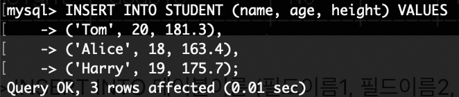 INSERT INTO <테이블명> (필드명1, 필드명2, ....) VALUES