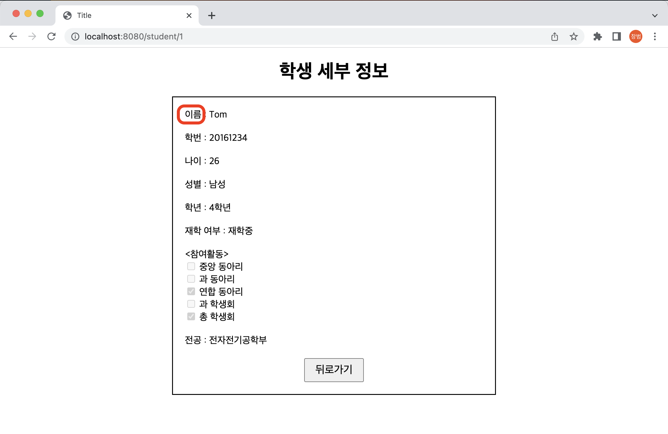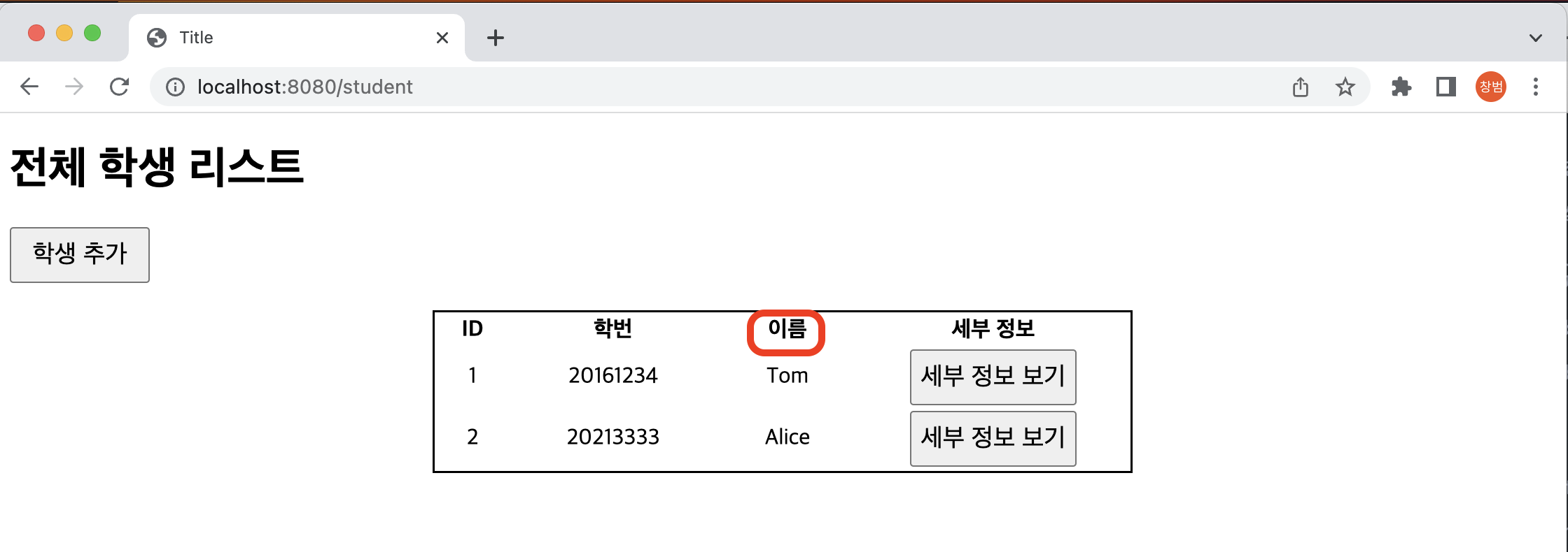 - 프로젝트를 실행해보면 전과 같이 "이름"으로 출력되는 것을 확인할 수 있음