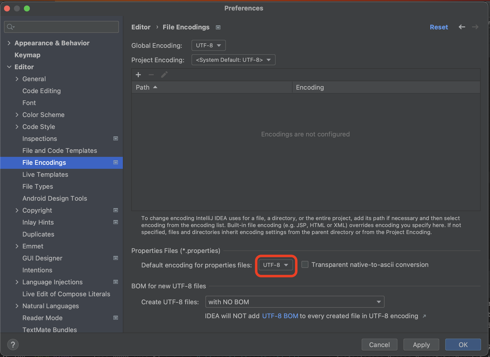 - Preferences(Settings) -> Editor -> File Encodings에 들어가서 표시한 부분을 UTF-8로 변경