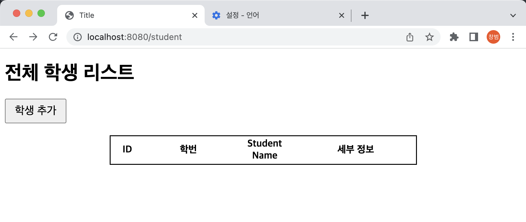 - 인터넷 브라우저에서 사용 언어를 영어로 변경 후 다시 접속해보면 아래와 같이 미리 설정해둔 "이름"만 "Student Name"으로 변경된 것을 확인할 수 있음