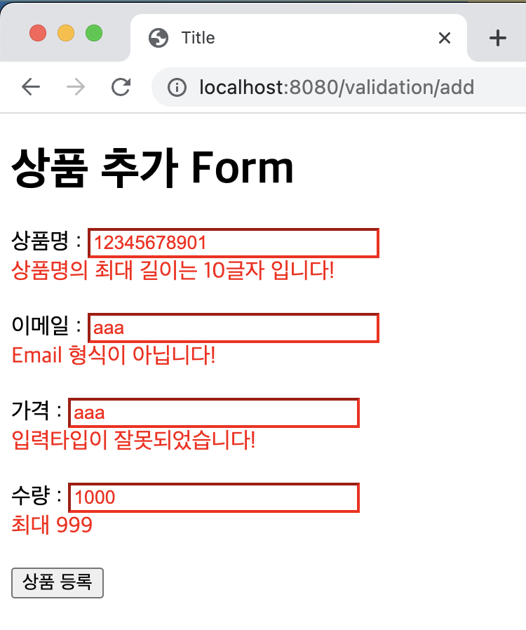 - validation을 통과하지 못하면 전에 사용자의 입력 + 에러메세지를 들고 다시 상품 등록 폼으로 이동시킴