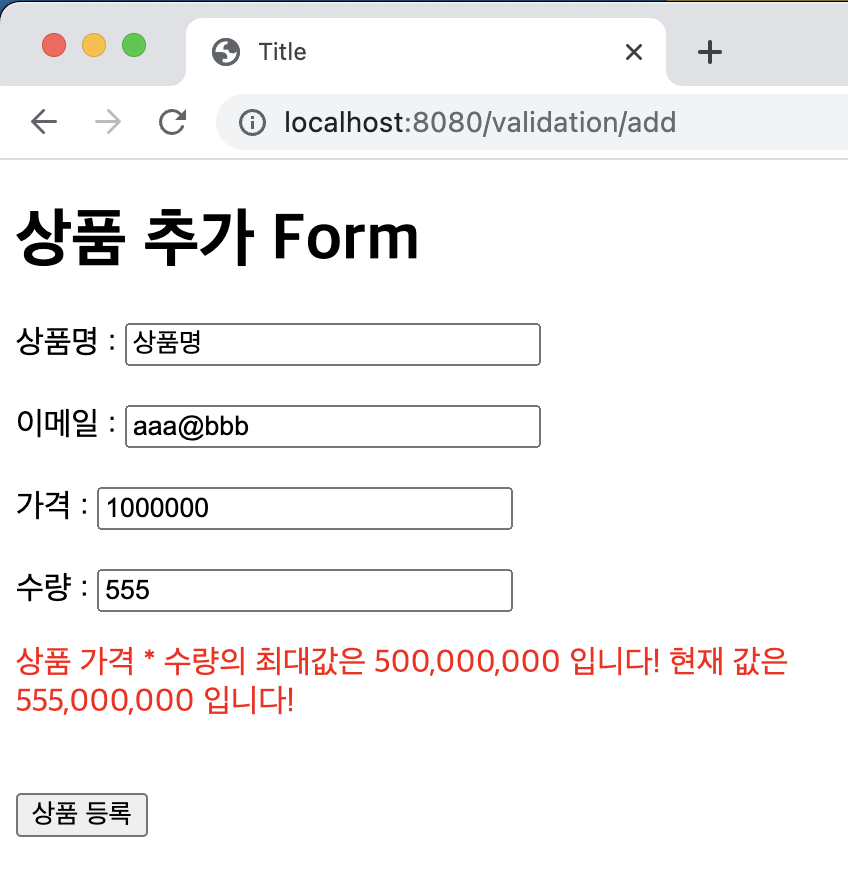 bindingResult.reject("overMaxTotalPrice", new Object[]{500000000, totalPrice}, "글로벌 에러 메세지");