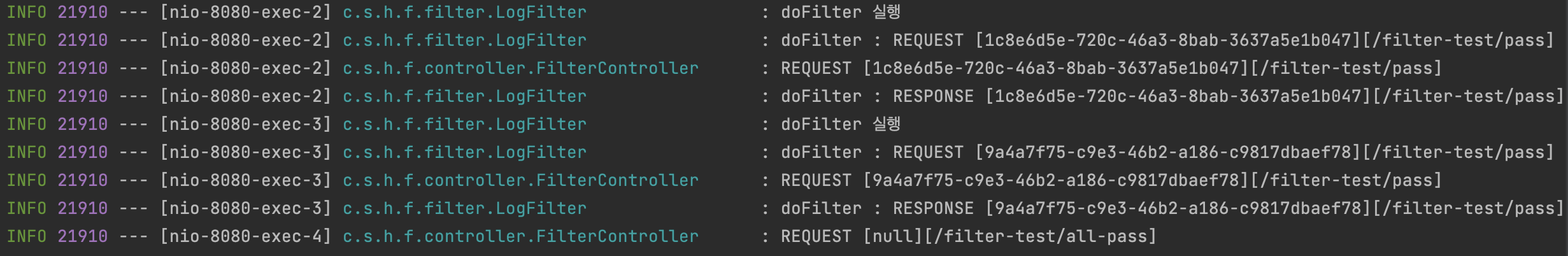 - /filter-test/all-pass로 요청 시 Filter을 거치지 않기 때문에 LogFilter에 들리지 않는것을 확인할 수 있고 logId가 null인 것도 확인할 수 있음