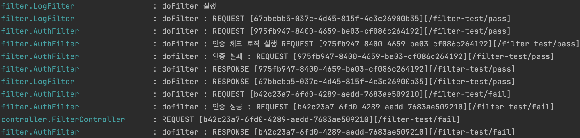 - /filter-test/pass로 요청 시 Filter을 거치기 때문에 LogFilter에서 로그가 찍힌것을 확인할 수 있음