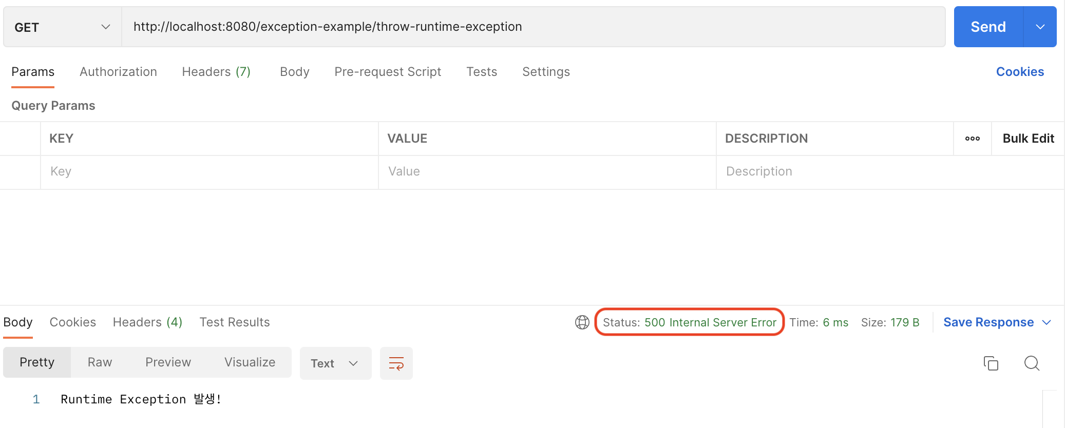 - log에는 원하는 exception이 제대로 발생하지만, response를 확인해보면 HttpStatus가 500인 것을 확인할 수 있음
